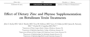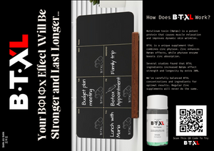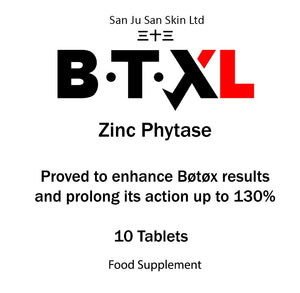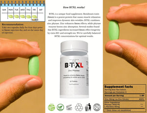 BTXL is a unique supplement (Zinc Phytase). Botulinum toxin (Bøtøx) is a potent protein that causes muscle relaxation and improves dynamic skin wrinkles. Zinc in BTXL enhances Bøtøx effects, while Phytase enzyme boosts zinc absorption. Several studies found that BTXL ingredients increased Bøtøx effect strength and longevity up to 130%. We've carefully balanced BTXL concentrations for optimal results. Regular Zinc supplements will never do the same job.